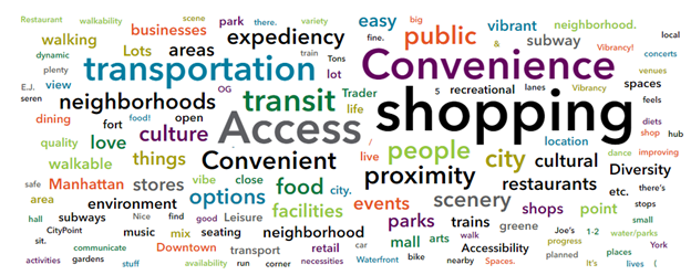 To the question “what do you like most about Downtown Brooklyn,” the responses were clear. As reflected in the word cloud below, the neighborhood’s top assets include accessibility, shopping, and convenience, showing how Downtown Brooklyn is a hub for easy living and vibrant activity.