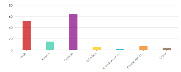 We asked participants how they travel to, from, and within Downtown Brooklyn and found that most people either take the subway or walk, reflecting the area’s excellent public transit options and walkability.
