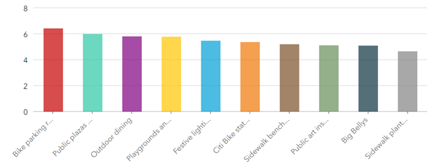 We asked participants to rank what public realm initiatives they would like to see more of in Downtown Brooklyn on a scale of 1 to 10. While the responses were varied, it’s clear that bike parking , followed by public plazas and open streets, and outdoor dining options are highly sought after.