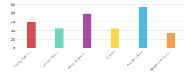 When asked what kinds of public programming they’d like to see, respondents noted greatest interest in seeing more arts and culture, and music and dance events.