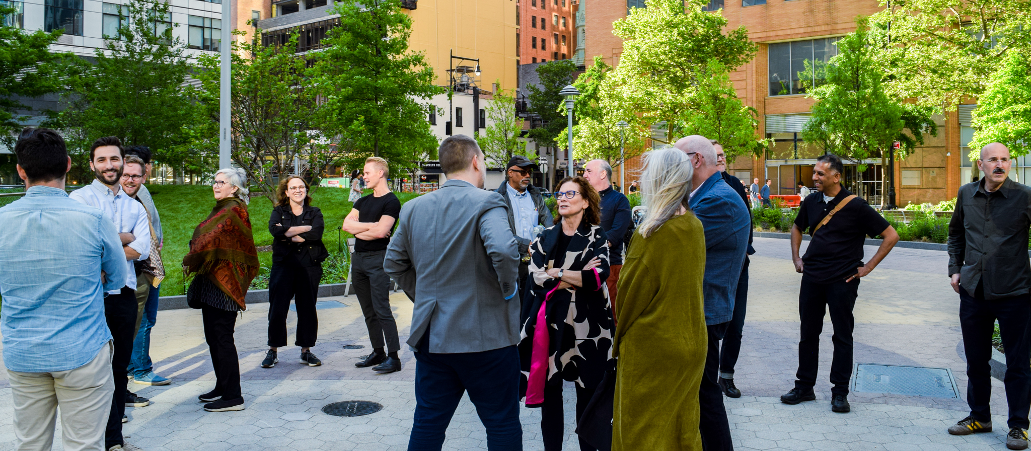 Throughout its first year, Abolitionist Place was the setting to several Make It in Brooklyn Design Socials, a series created to strengthen connections within Downtown Brooklyn’s design community. The first event took place in May 2024 in partnership with FXCollaborative. Mary Margaret Jones of Hargreaves Jones led guests on a walking tour of the newly opened park, sharing insight into its evolving design process. Afterwards, attendees gathered for refreshments and networking on FX’s terrace, which offered stunning views of the park and skyline.