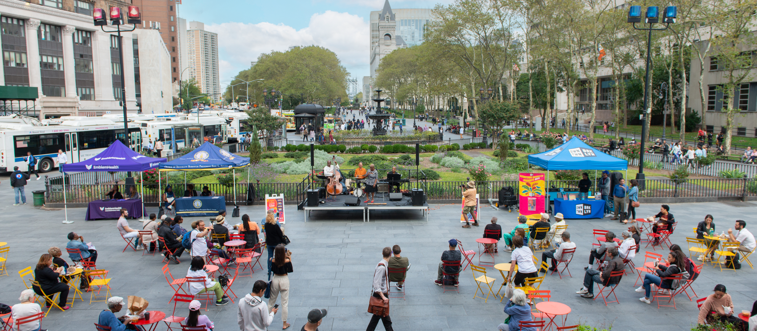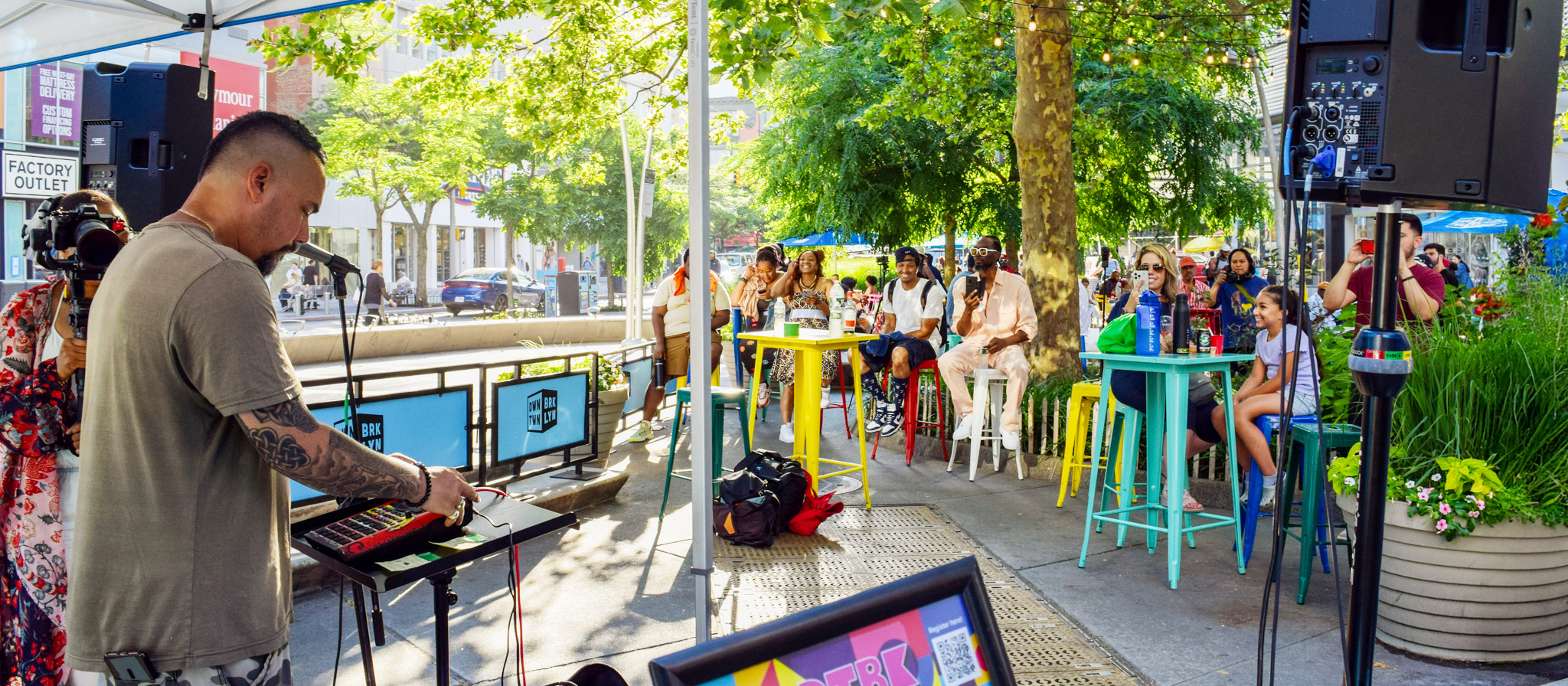 Albee Square is where the energy of Downtown Brooklyn truly shines. With colorful furniture and umbrellas; a steady flow of foot traffic; and tons of nearby shops, it’s a natural hub of activity and visual interest. The space often hosts performances, parties, and family-friendly events, adding extra vibrance to an already dynamic setting. It’s the kind of place where everyday moments feel effortlessly cool and full of character.