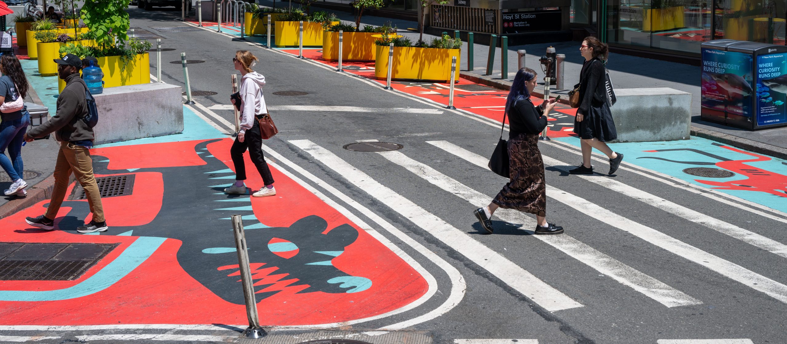 Downtown Brooklyn’s latest asphalt art murals, titled Fear No Frontier, turn ordinary streets into extraordinary canvases. Designed by artist Isolina Minjeong, the murals bring together bold colors and myth-inspired imagery of tigers, dragons, and flowers. Installed across the neighborhood’s Shared Streets, the murals create a walkable gallery that celebrates the culture and energy of the city. It’s the kind of street art that practically begs you to stop, strike a pose, and capture the moment.