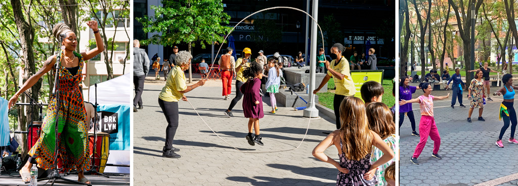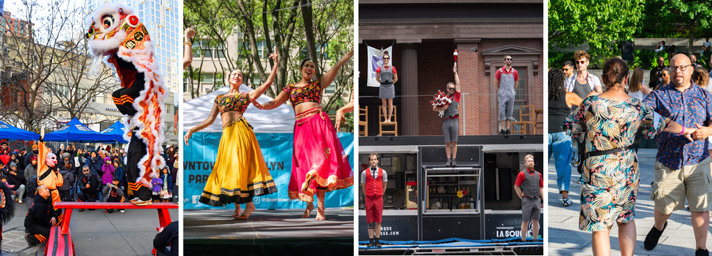 The Downtown Brooklyn Presents series of free public programming yet again brought amazing events to the neighborhood’s public spaces. The season began with a Lunar New Year celebration at Albee Square, followed by Car-Free Earth Day in April. Spring saw the return of Albee Square Happy Hours; Ping-Pong with The Push and Zumba with Natarsha McQueen at Brooklyn Commons Park. Summer brought weekly lunchtime shows at Brooklyn Commons Park; salsa nights at Willoughby Plaza; jazz concerts with Jazz Foundation of America and the Office of the Borough President at Columbus Park; summertime dance parties such as Vinyl Nights at Albee Square plus Friday Night Dance and Bare Feet Downtown Brooklyn with Mickela Mallozi on The Plaza at 300 Ashland. Fall featured the joyful BQE Strings at Willoubghby Plaza, the raucous NYC Marathon Mile 8 Cheering Station at 300 Ashland; Fall Into Step lunchtime performances at Brooklyn Commons; a family-friendly Halloween party, BKLYN BOO!, at Albee Square; and the year-end close out, DTBK Gets Lit!, the annual Albee Square holiday lighting ceremony.