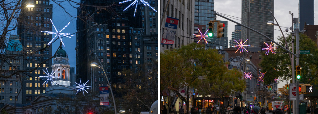 Downtown Brooklyn’s new holiday lights launched, with Fulton Street, Court Street, and Abolitionist Place, as the first phase of a gradual rollout. The neighborhood will now shine with a new generation of holiday lighting – an adaptive, programmable network that transforms streets into living lightscapes. Designed by Limbic Media, each installation is distinct and is programmed to shift hues, pulse in rhythm, or cascade dynamically, offering ever-changing combinations of color and motion.
