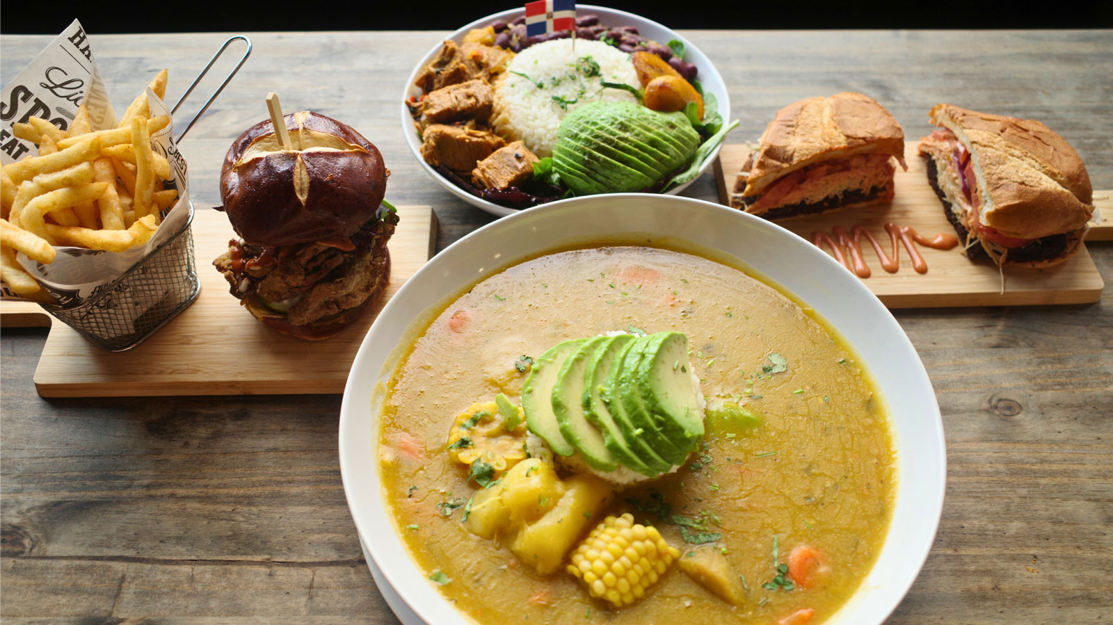 Front: Sancocho, Back Row: Sweet & Spicy Oyster Mushroom Burger (with fries), La Bandera, The Chimi