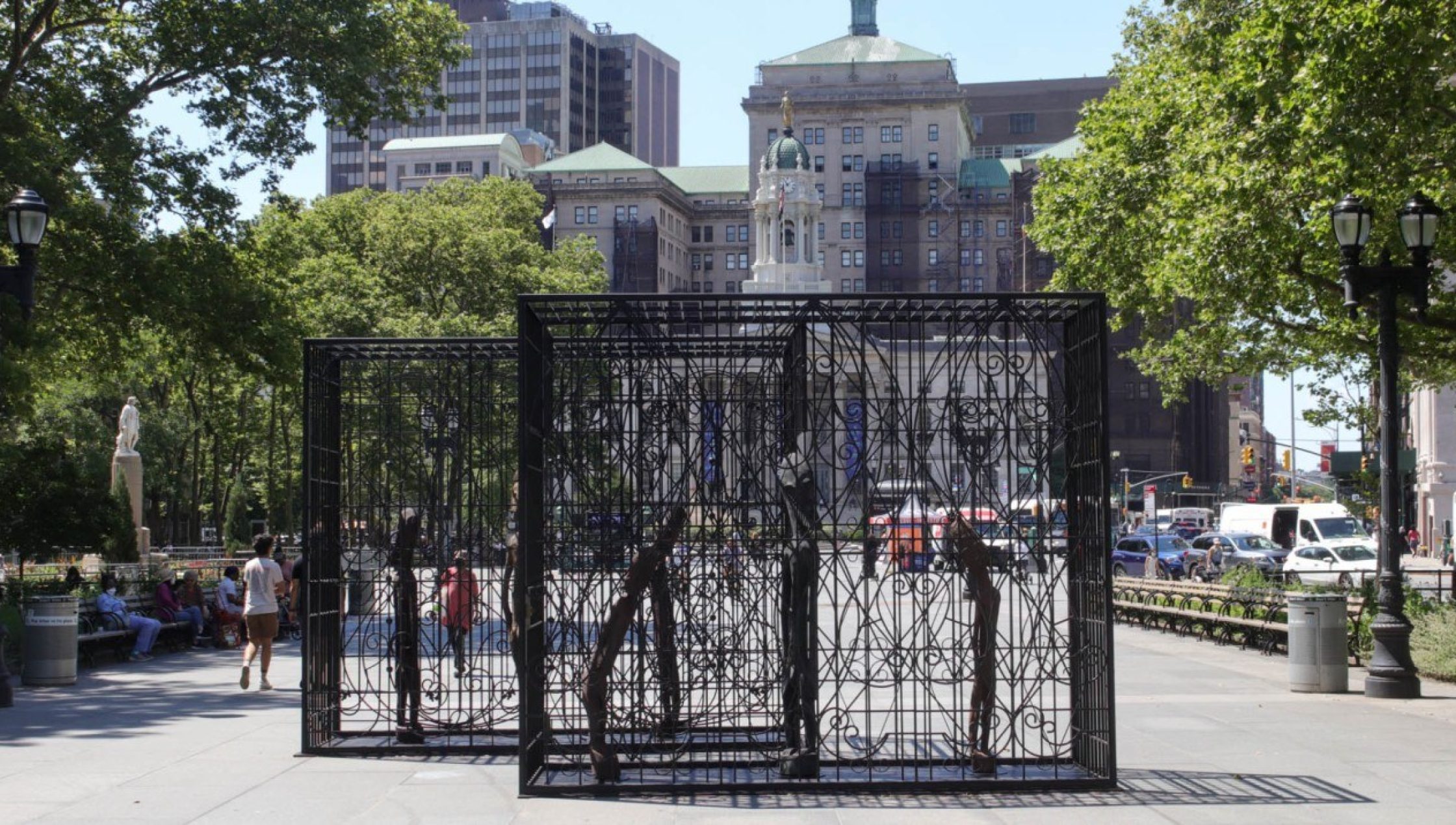 More Art, a NYC-based organization that supports collaborations between professional artists and communities to create public art and educational programs committed to social justice, has worked with renowned artist Fred Wilson to create a temporary public art installation in Downtown Brooklyn. Wilson’s artwork is a large interactive sculpture, composed of layers of decorative ironwork and fencing. Viewers encounter the elaborate structure comprised of three elaborately framed boxes of various patterns, revealing statues and busts of African, Latinx, and Native American origin held within. The complex mesh of wrought iron fences and bars at times evoke prison bars, and at other times gated communities. The piece asks viewers to consider perspective. Who is looking in? Who is looking out? Who is free? Who is trapped?