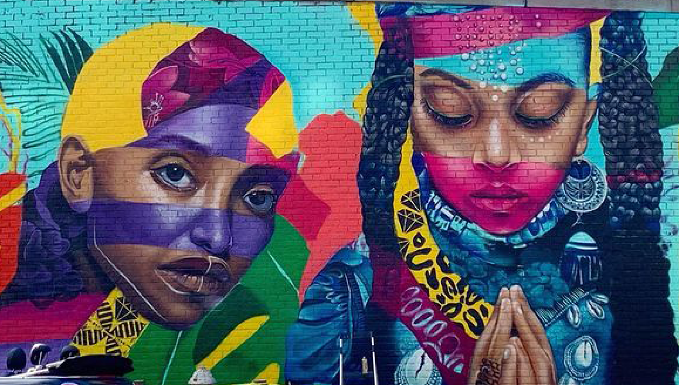 “This mural celebrates the African Diaspora and contemporary Afro Futurism. The two females are a symbol of strength, black pride, and beauty. The multi-cultural patterns are inspired by African mud cloth. The neo-indigenous patters are original and created by Marka27. The tropical background, bold colors, and tie back to the motherland Africa with flowers, plants, and animals native to Africa.”