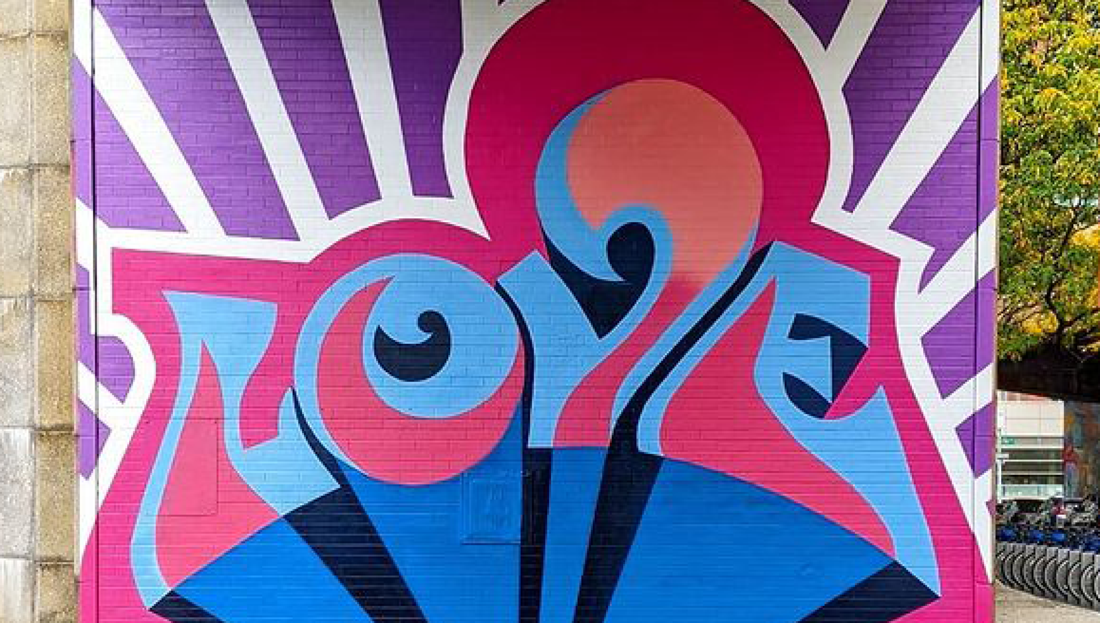 “My LOVE murals are designed to encourage the viewer to think and see beyond the surface. The work inspires examination and positive conversation. The images, graphic shapes, and vivid colors relate to the complexity of our diverse community.”