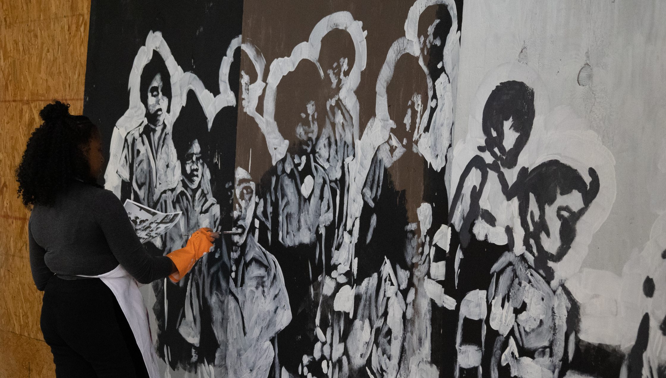 “The concept [of this mural] stems from the necessity to acknowledge the legacy of the generation that came before that fought for our rights and freedom as we continue to contend for the destiny we deserve. It also speaks to the importance of spiritual warfare and how a battle must be won spiritually before it is won physically. The background [incorporates] a color bars theme and use of the ginkgo African fabric for my cultural pattern that will appear throughout the mural.”“