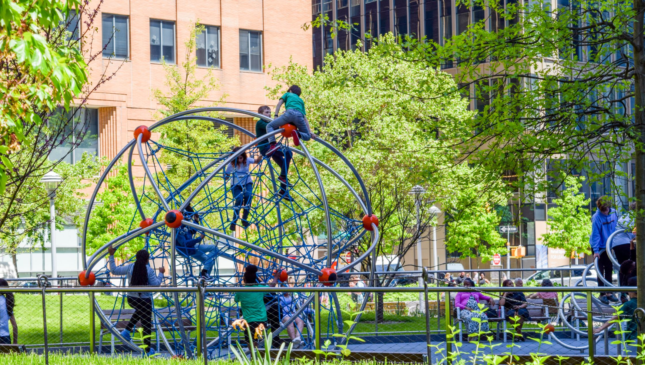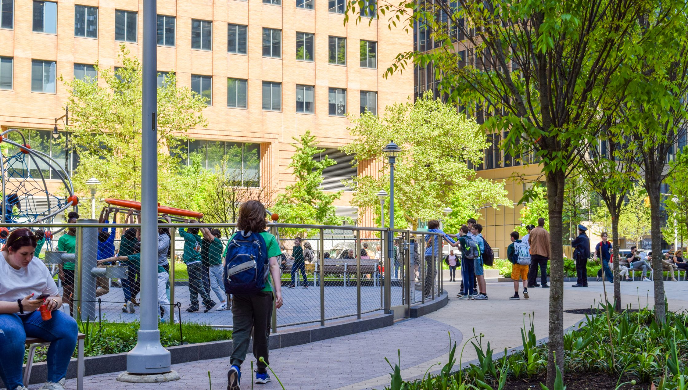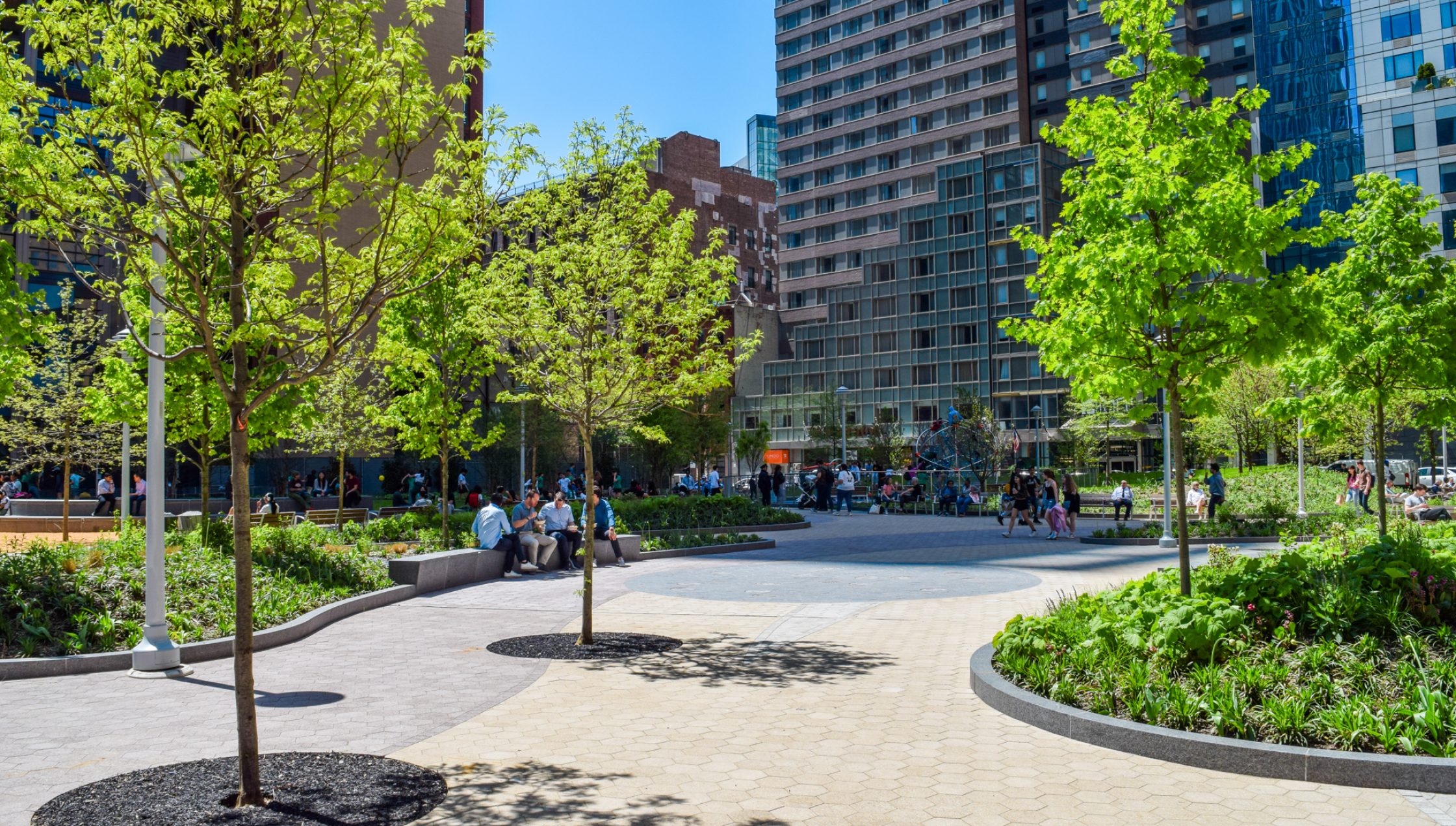 Abolitionist Place brings 1.15 acres of green space and community amenities to Downtown Brooklyn, further enhancing the growing commercial, residential, and cultural hub. Designed by renowned landscape architecture firm Hargreaves Jones, Abolitionist Place includes a new play area, water feature, lawn space, dog park, lush ornamental plantings, and multiple seating areas.