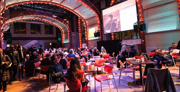 First designed as a ballroom, then recast as a theater for groundbreaking work, The Adam Space took its current design in 1997 as BAM’s flexible public living room, a dazzling open-plan hall housing BAMcafé. Hardy Holzman Pfeiffer Associates oversaw the renovation, preserving the spaciousness of the original ballroom with vaulted red arches lined with silver-tipped light bulbs. This dramatic space makes a stylish setting for receptions, meetings, and parties