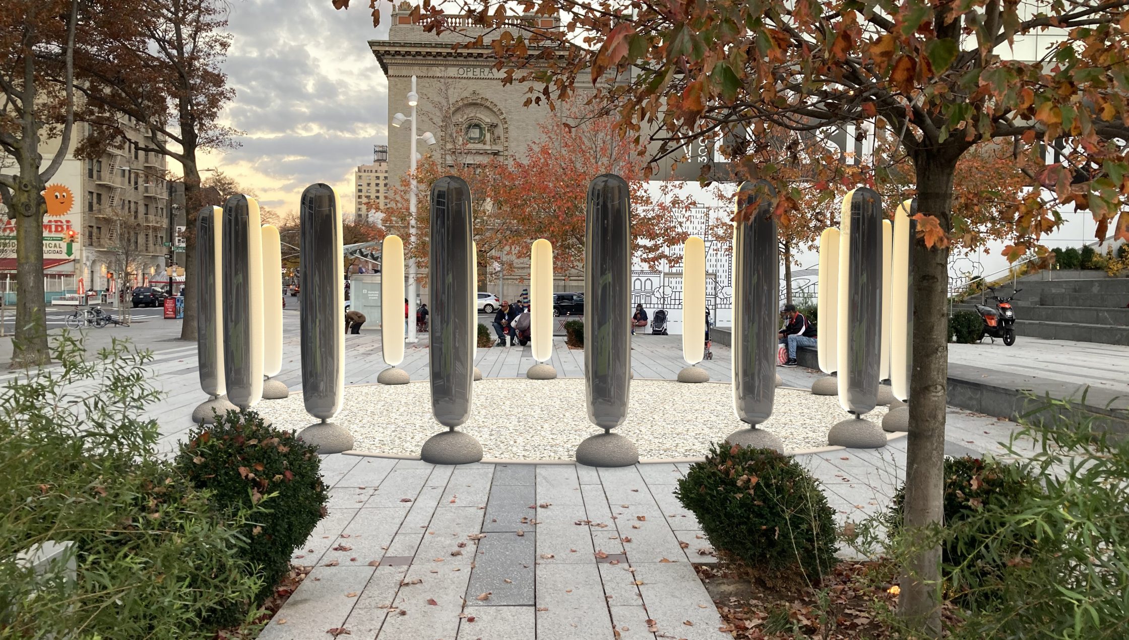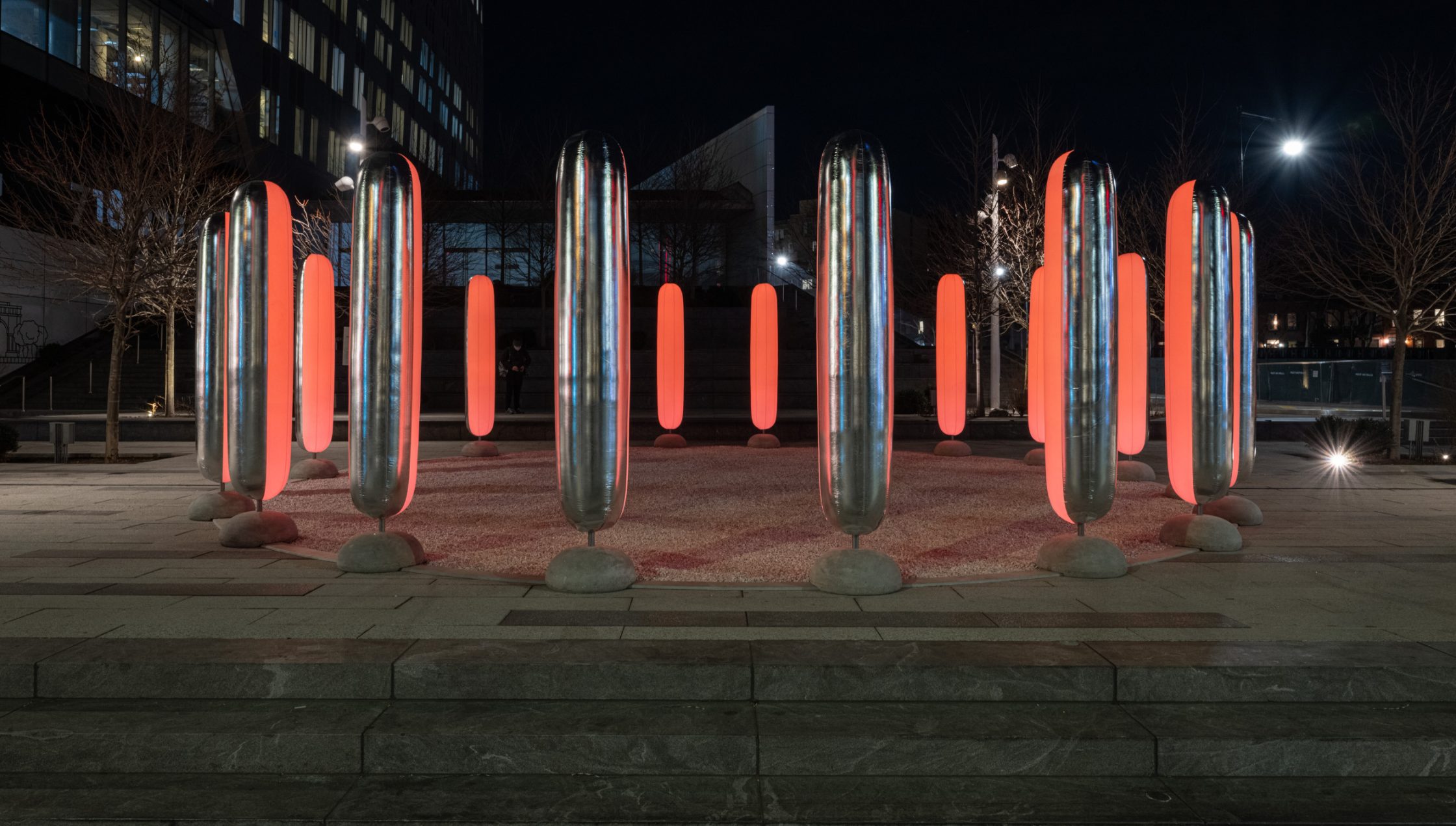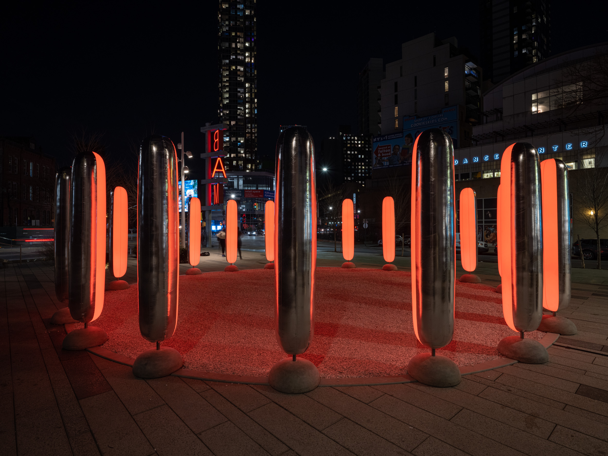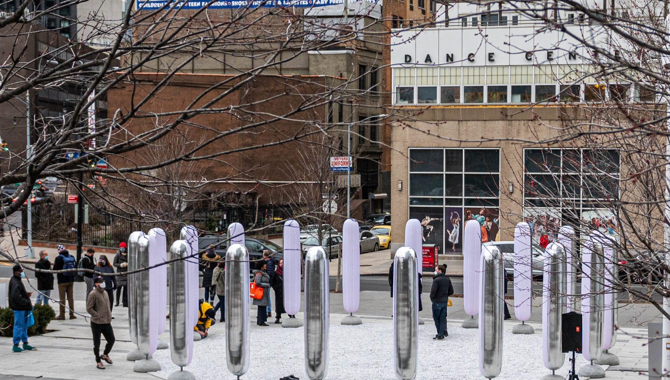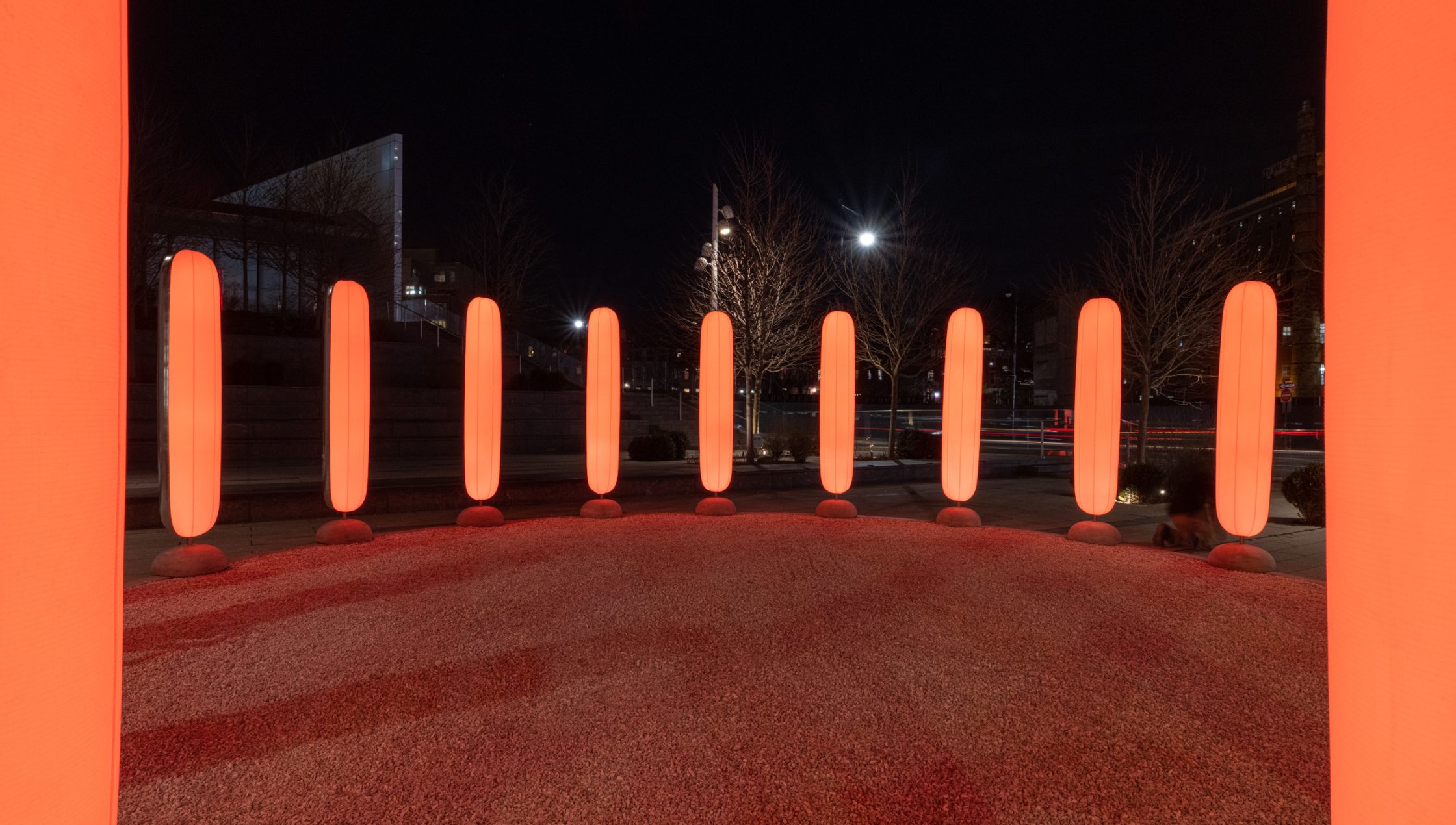 Breathing Pavilion comprises a 30-foot circle of 20 nine-foot two-tone illuminated inflatable columns that slowly modulate in brightness to illustrate a deep breathing technique designed to bring calm. Viewers are invited to breathe in time with the changing light and attune themselves to a shared rhythm of respite. Over its six-week installation period, Breathing Pavilion will host a series of site-specific events, including musical performances. Musicians in the series include Keyon Harrold on trumpet, Melanie Charles on flute, Joel Ross on vibraphone, and Baba Don Babatunde of the Last Poets.