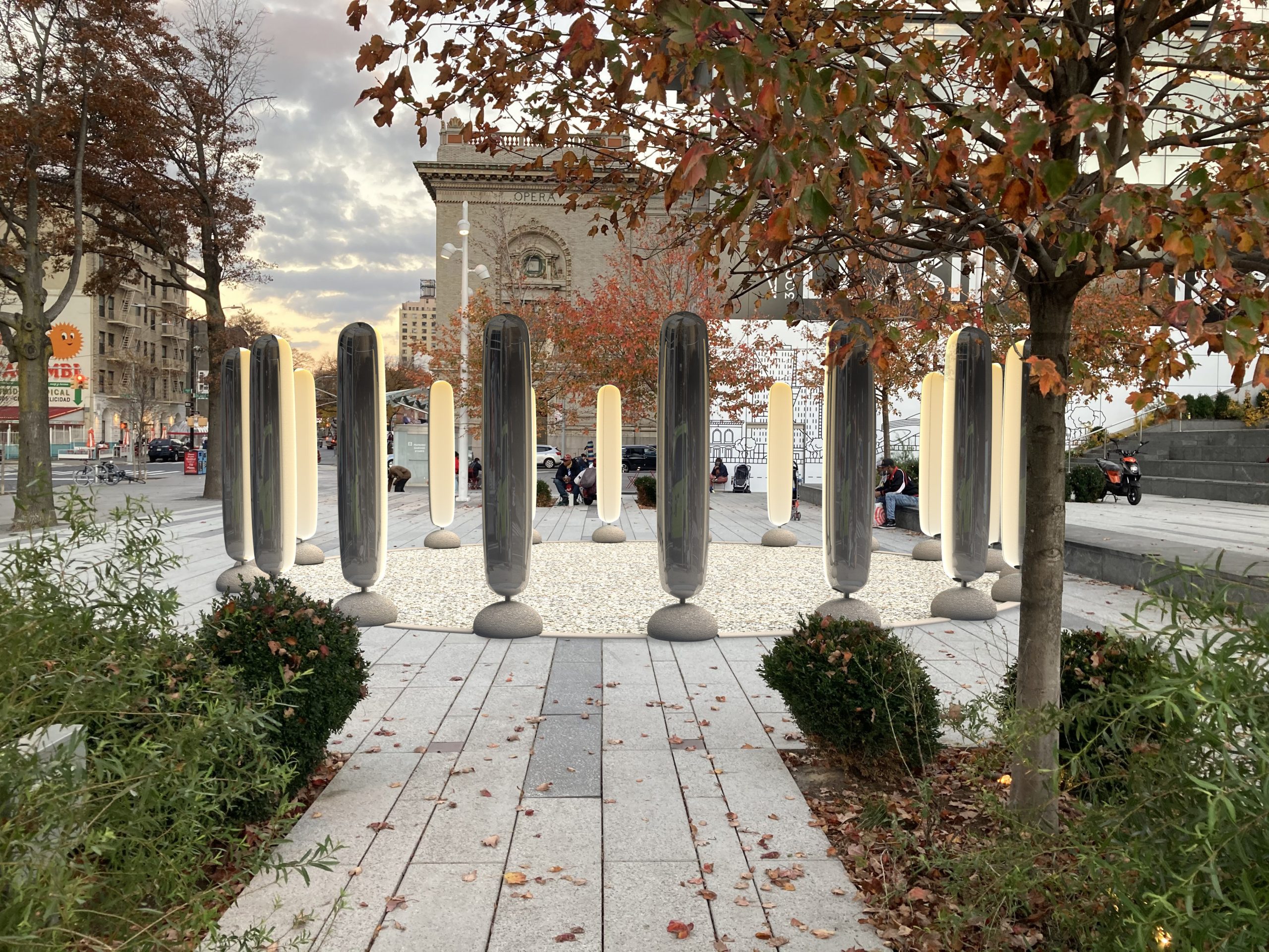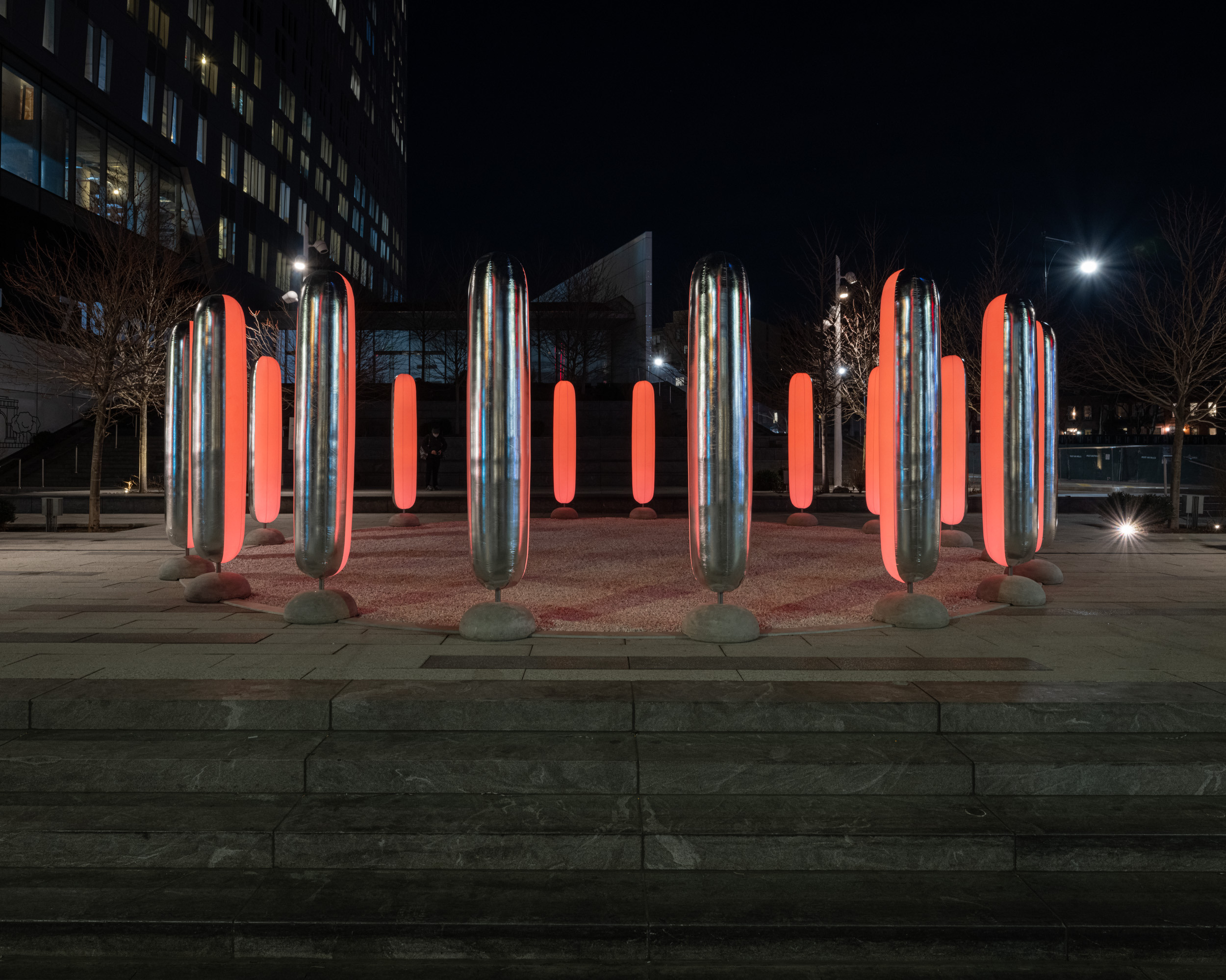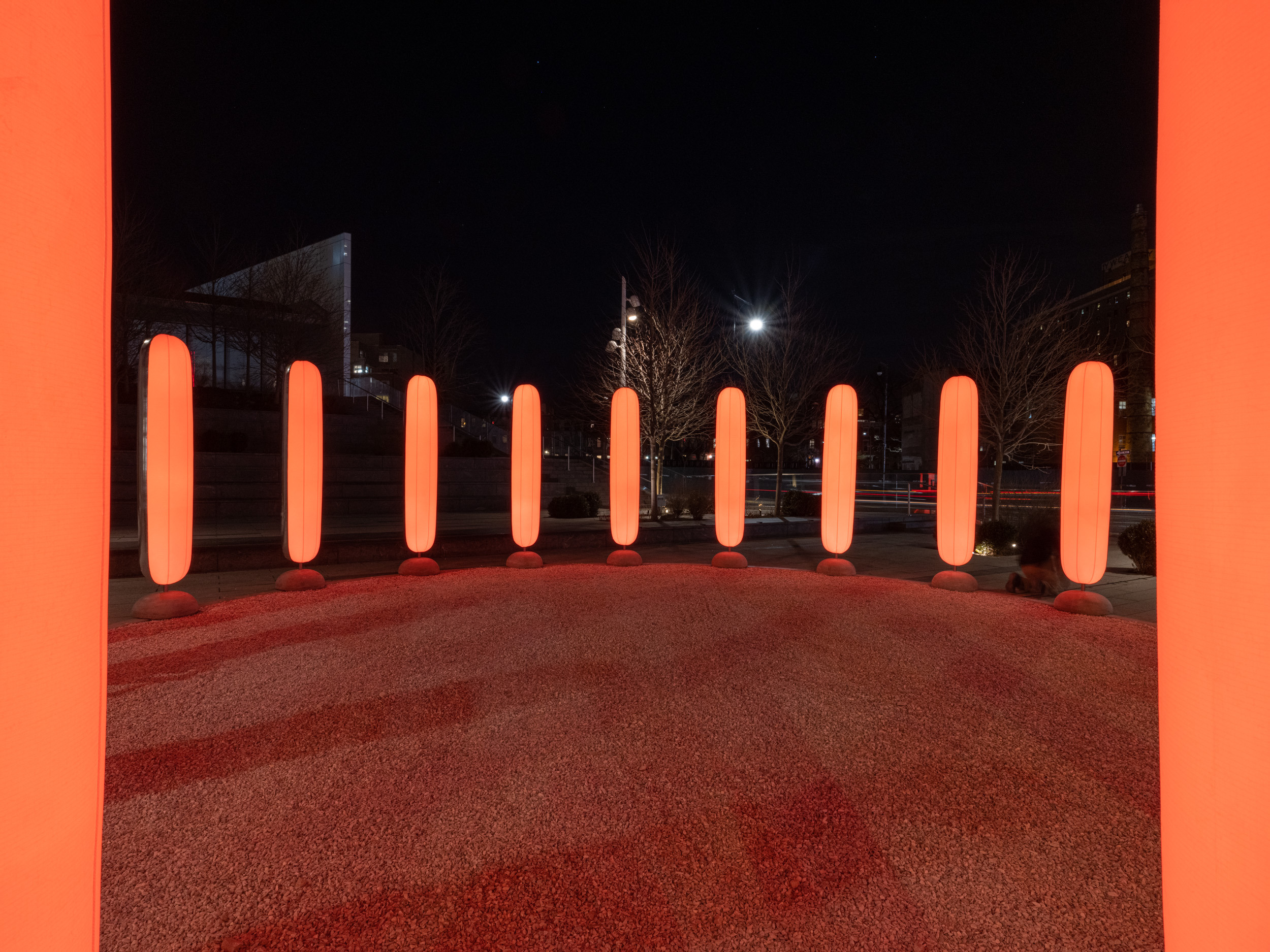 Breathing Pavilion comprises a 30-foot circle of 20 nine-foot two-tone illuminated inflatable columns that slowly modulate in brightness to illustrate a deep breathing technique designed to bring calm. Viewers are invited to breathe in time with the changing light and attune themselves to a shared rhythm of respite. Over its six-week installation period, Breathing Pavilion will host a series of site-specific events, including musical performances. Musicians in the series include Keyon Harrold on trumpet, Melanie Charles on flute, Joel Ross on vibraphone, and Baba Don Babatunde of the Last Poets.