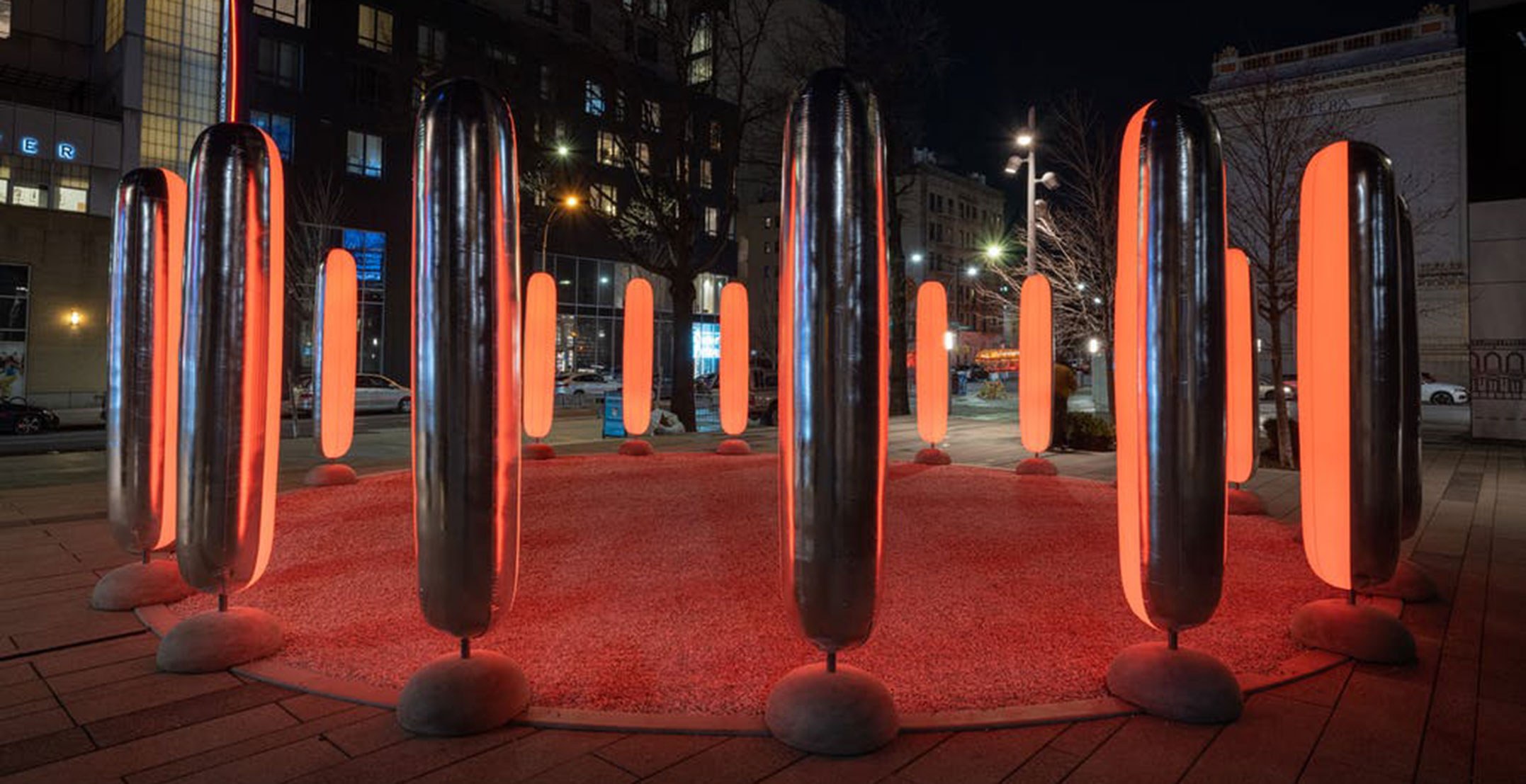 Artist Shervone Neckles’ BEACON honors the legacy of African American inventor Lewis H. Latimer (1848-1928) at Albee Square. The interactive steel and LED sculpture pays tribute to Latimer’s work on the carbon filament that made the electric light possible. The installation is part of the Downtown Brooklyn + DUMBO Art Fund.