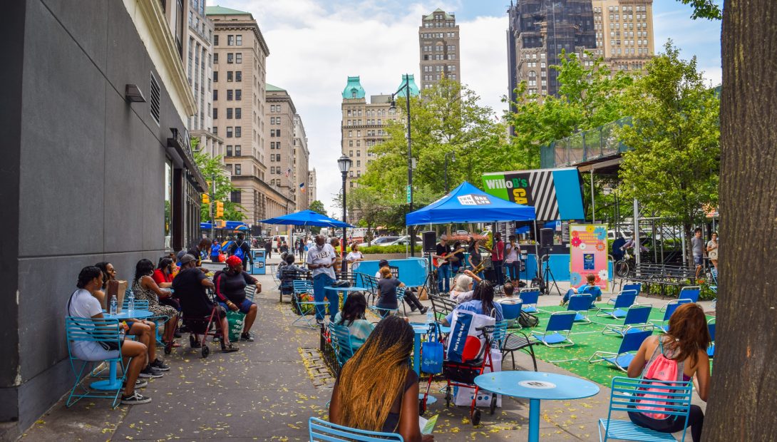 Working in close collaboration with the Downtown Brooklyn Partnership, the DOT is currently installing a network of Shared Streets within Downtown Brooklyn to support a pedestrian-centric business district. Shared Streets deploy unique street designs that naturally slow traffic and prioritize pedestrians and cyclists while still allowing for local vehicle access for deliveries and pick-ups or drop-offs. This neighborhood network better allocates streets for the majority of its users – pedestrians – to create more welcoming, vibrant public spaces and strengthen the local economy.