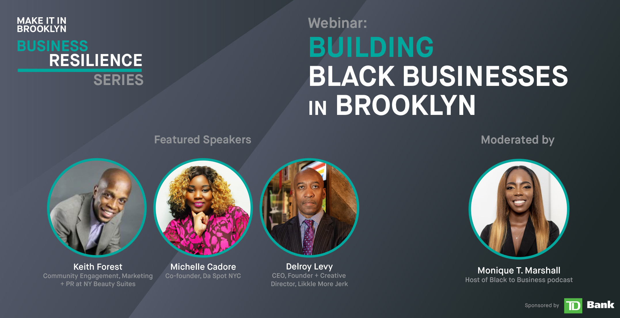 The series, made possible with a grant from TD Bank, kicked off with Building Black Businesses in Brooklyn, a virtual discussion moderated by Monique T. Marshall, co-founder of the organization Black to Business, and featuring panelists Michelle Cadore, co-founder of DA SPOT NYC and CEO of YES I AM Inc.; Keith Forest, marketing and PR strategist at NY Beauty Suites; and Delroy Levy, CEO and founder of Likkle More Jerk.