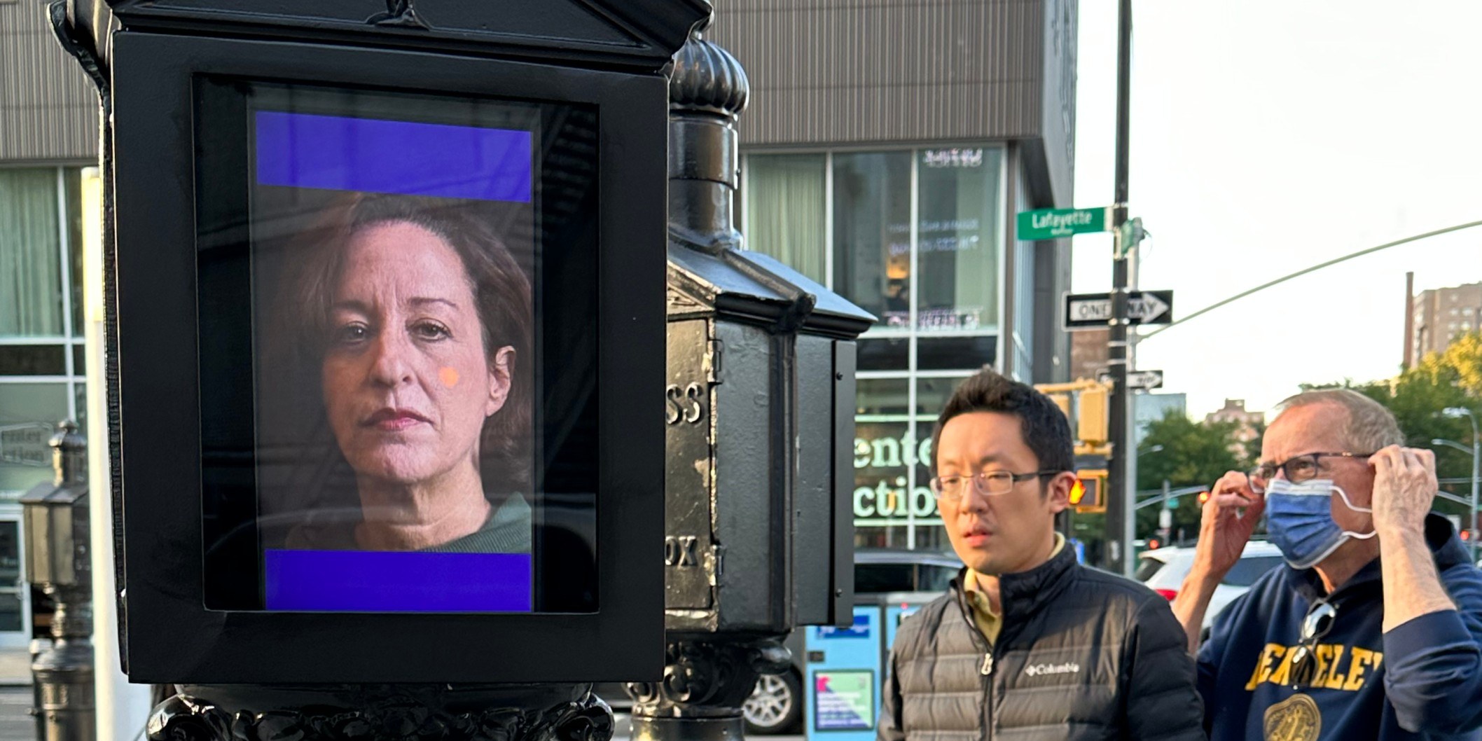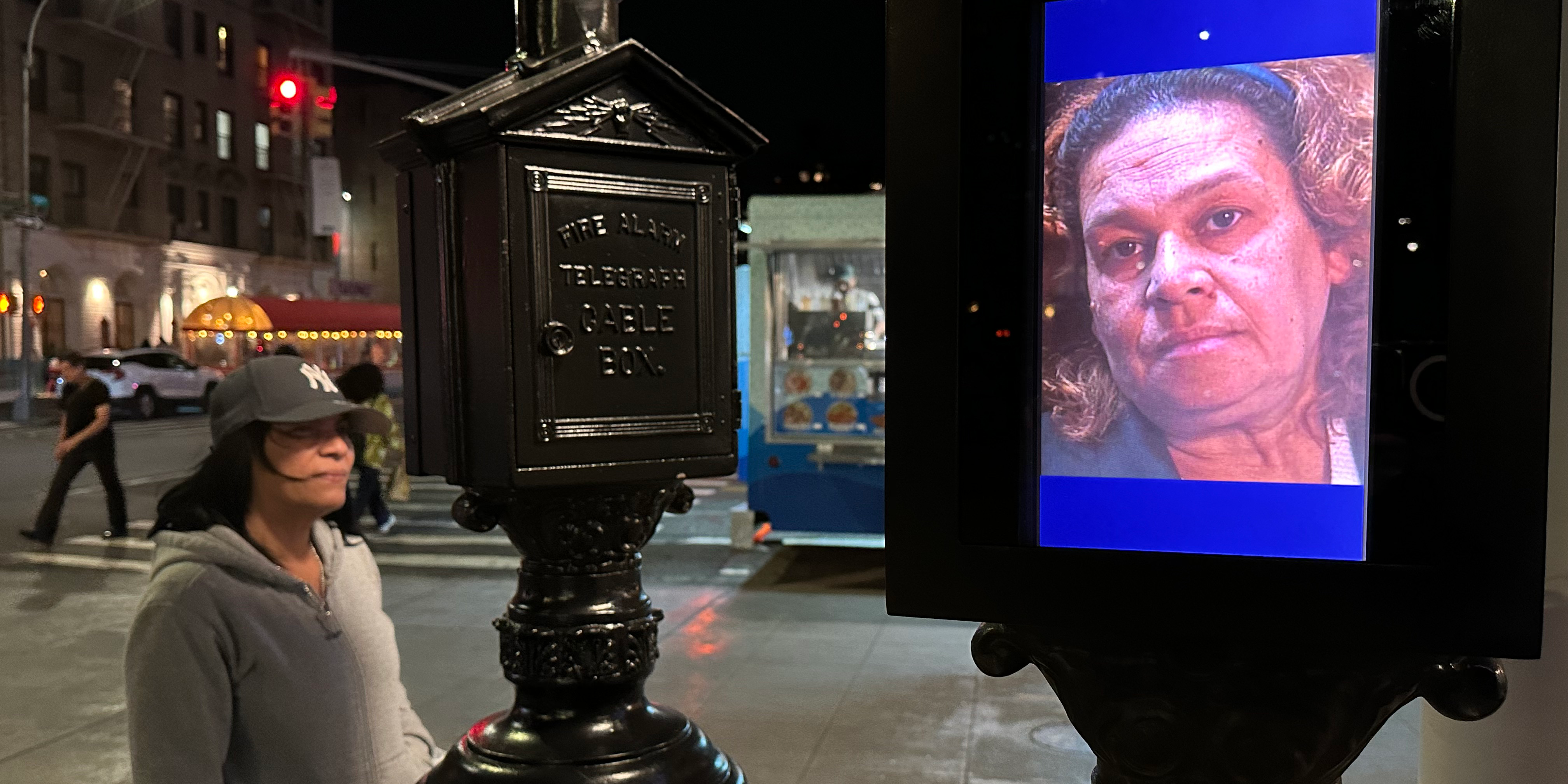 With six, 7-foot-tall call box structures placed around the Plaza, Witnessing offers viewers a place to honor victims and survivors while considering society’s role in advocating for systemic change. The audio-visual elements displayed through the call boxes draw the viewer in, creating an intimate experience that allows for observation and reflection. Witnessing was created with support from curator Scott Propeack, fabricator Fja’h Salehi, and video editor Efe Ozmen.