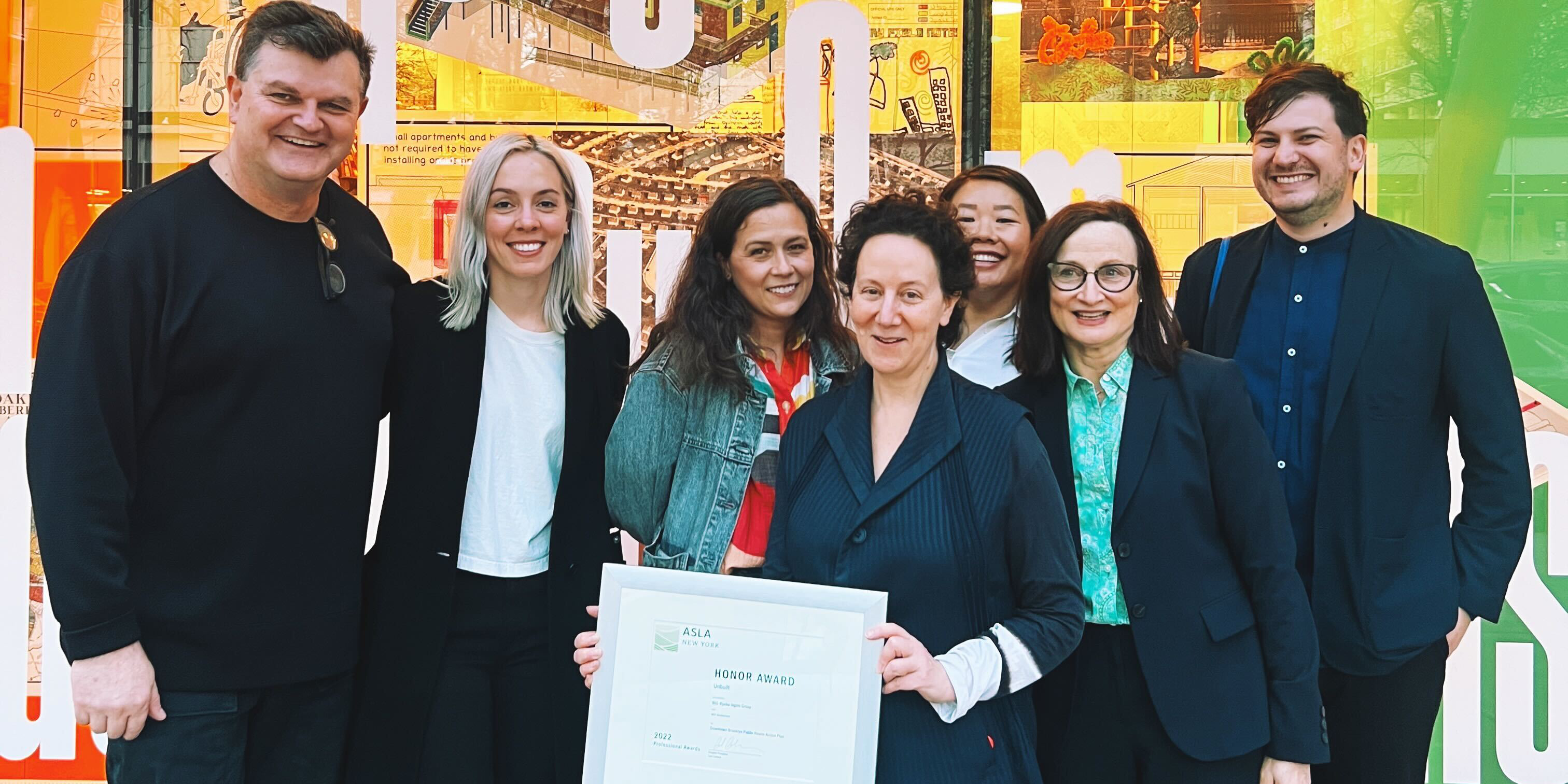 On April 13, the Downtown Brooklyn Public Realm Action Plan was awarded a 2022 American Society of Landscape Architects (ASLA) NY Honor Award. Organized by the ASLA-NY Chapter Awards Committee, the awards bolster local visibility and publicly recognize excellence in the practice of landscape architecture. DBP’s Regina Myer and May Yu; Bjarke Ingel Group’s Kai-Uwe Bergmann, Kate Cella and Morgan Mangelsen; and WXY Architecture’s Claire Weisz and Rob Daurio accepted the award at a ceremony held at The Center for Architecture in Manhattan.