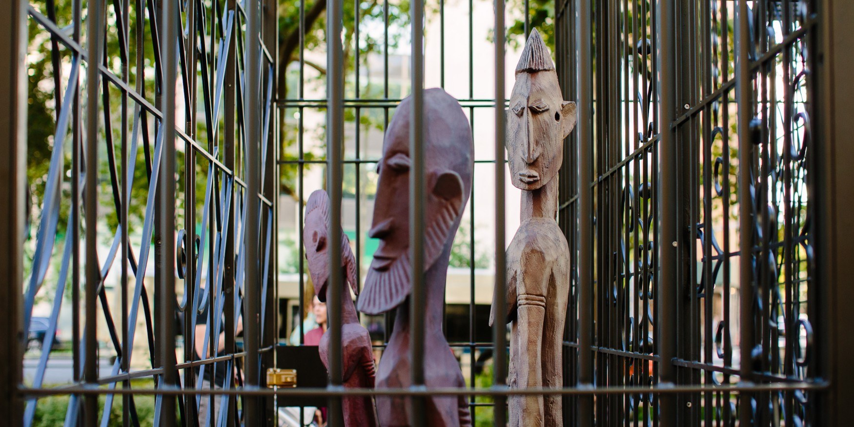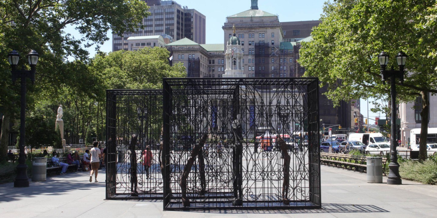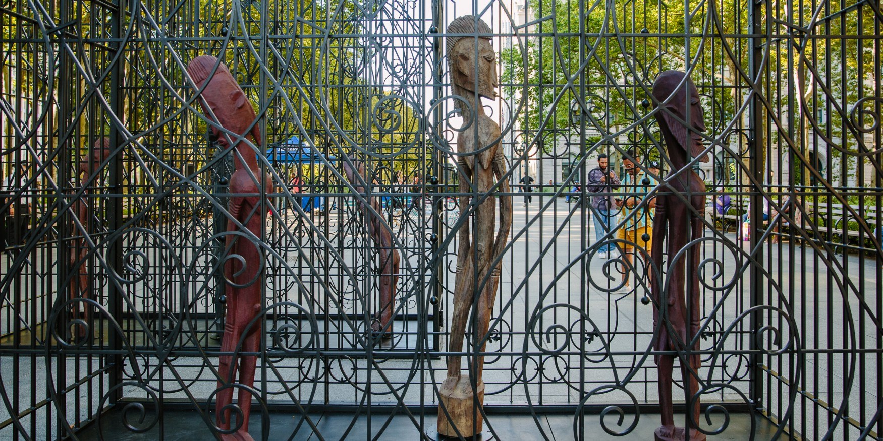 DBP is pleased to present Mind Forged Manacles/Manacle Forged Minds, Fred Wilson’s first ever large-scale public sculpture, which opens at Columbus Park, Downtown Brooklyn on Tuesday June 28, 2022, and closes a year later, in June 2023. One of the projects funded through the Downtown Brooklyn + Dumbo Art Fund, under New York State’s Downtown Revitalization Initiative (DRI), this installation features a 10-foot-tall sculpture composed of layers of decorative ironwork, fencing, and statues of African figures.