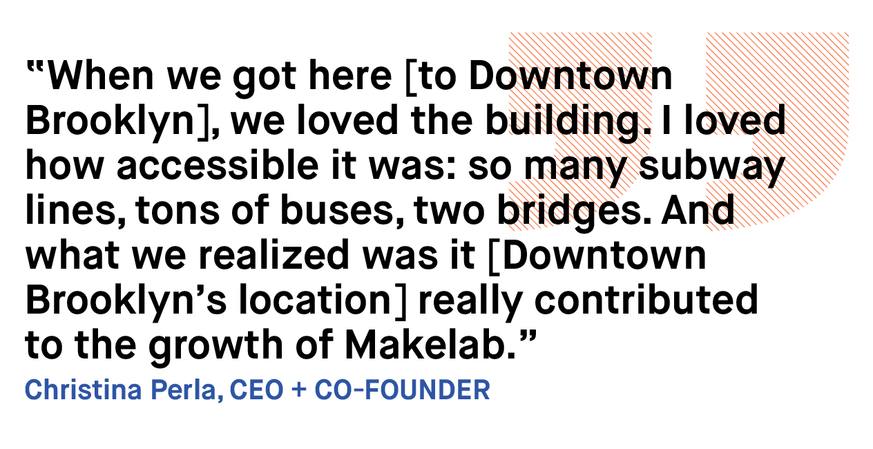 Makelab found their current office space by chance. Unfamiliar with Downtown Brooklyn, they were pleasantly surprised to find the Clocktower Building, which was previously home to a traditional printing press. Settling into a historic loft building at a competitive price, with great transit access to boot, was perfect for their team. When not in the office, you can find the Makelab team at City Point’s DeKalb Market grabbing a bite or joining Tuesday night trivia at Circa Brewing Company on Lawrence Street. Makelab has plans to grow their operations with additional offices and production centers in Manhattan – while keeping Downtown Brooklyn as their homebase.