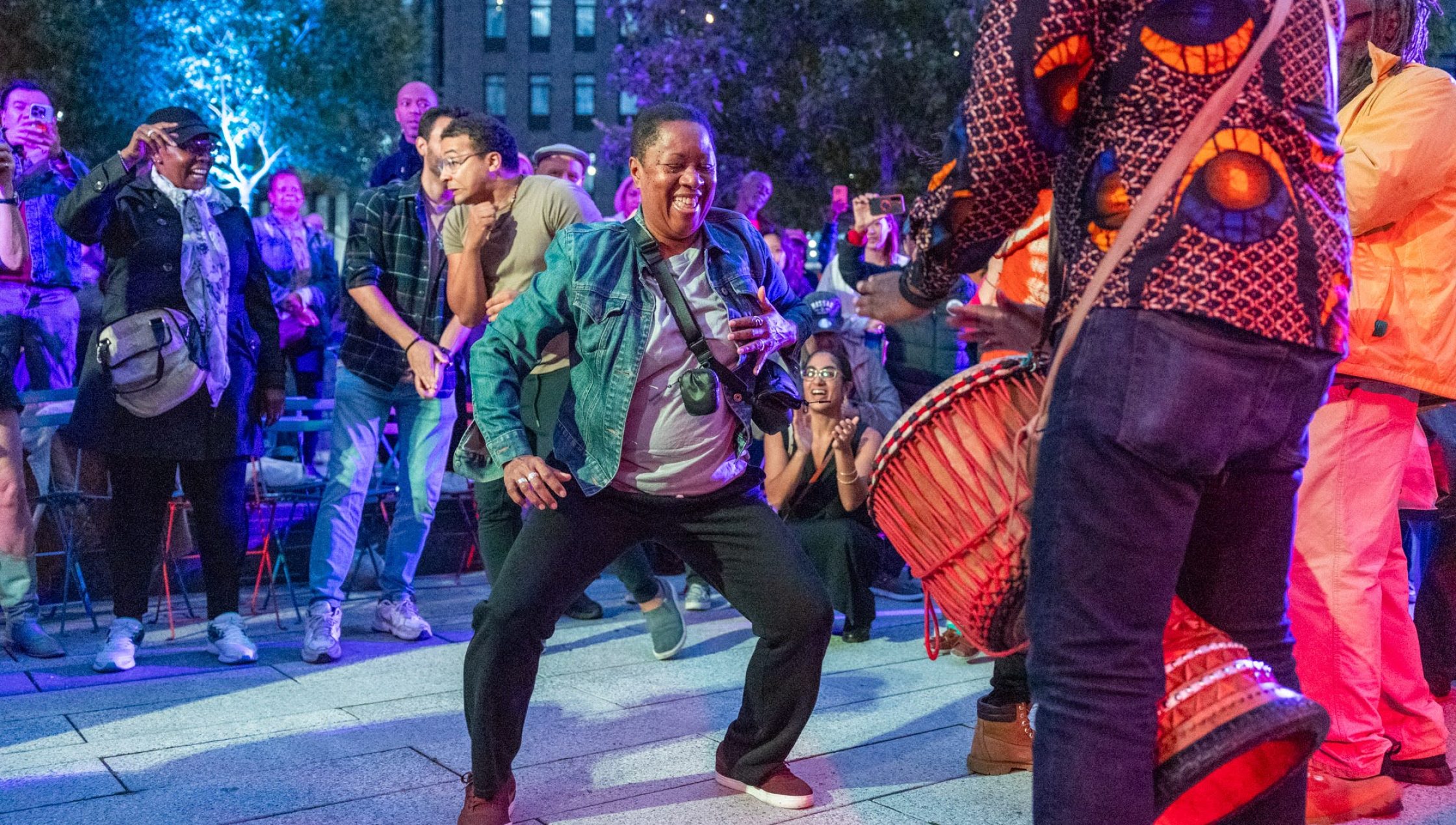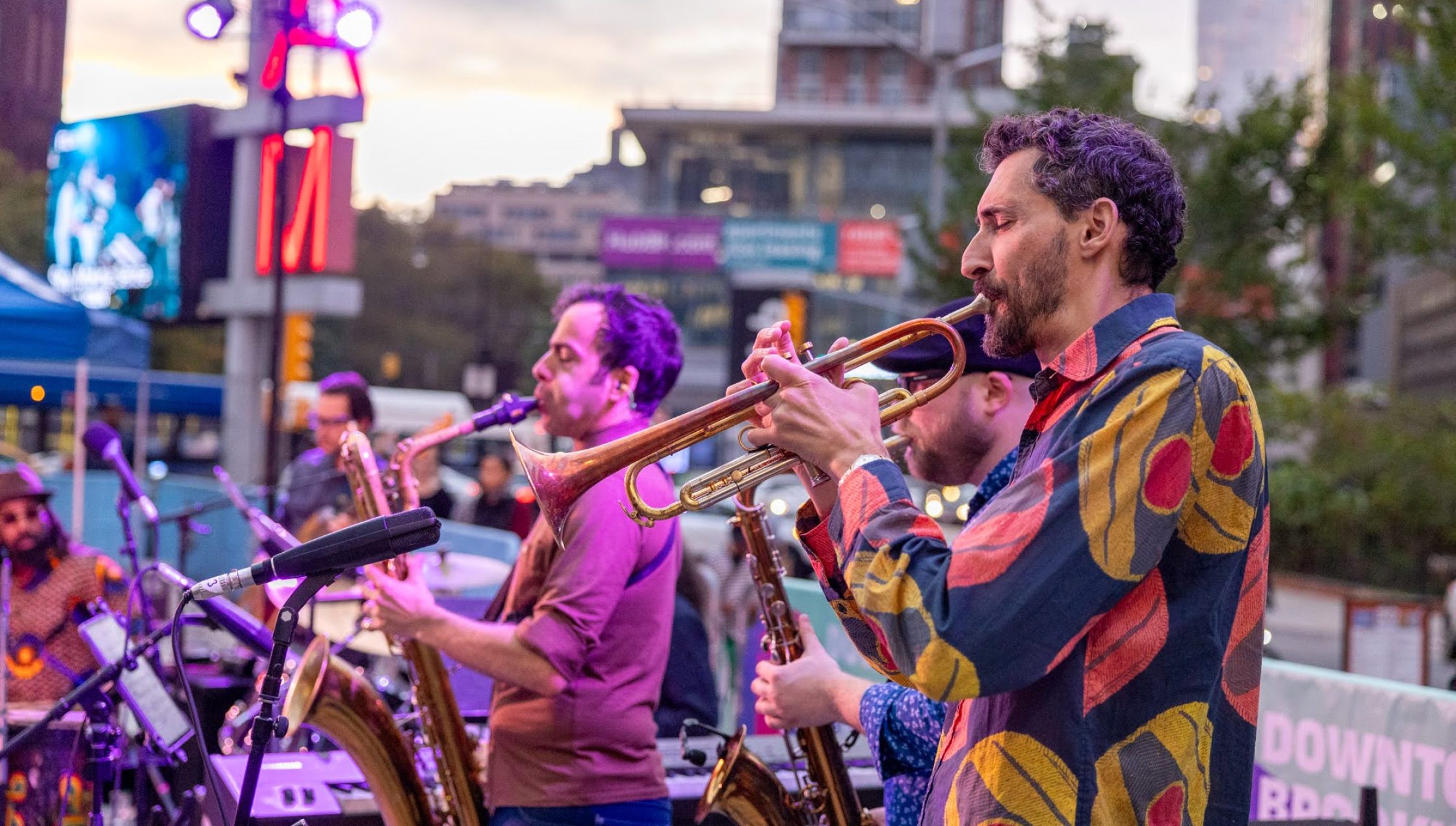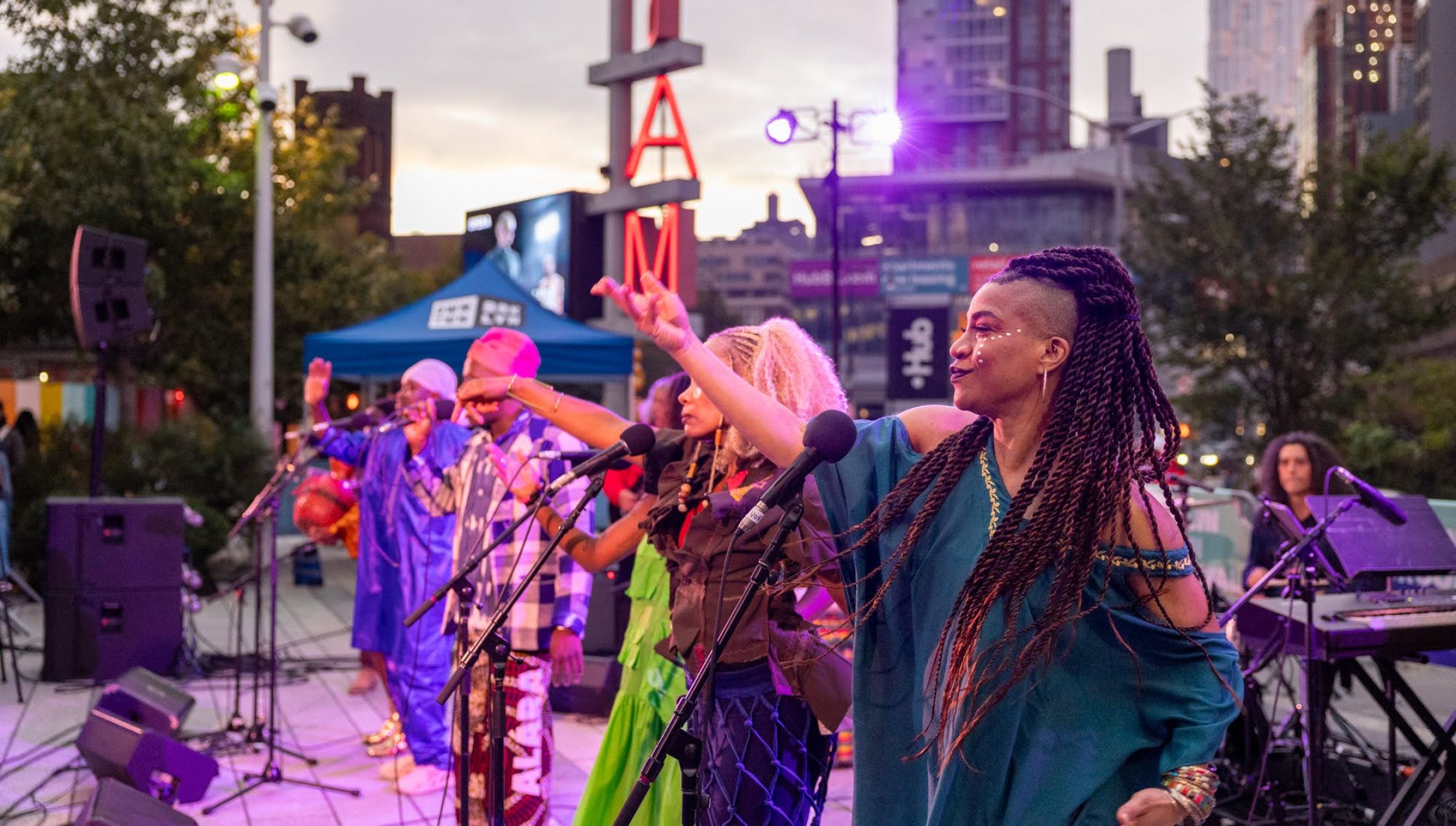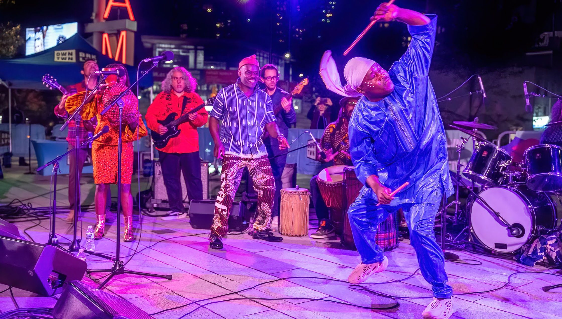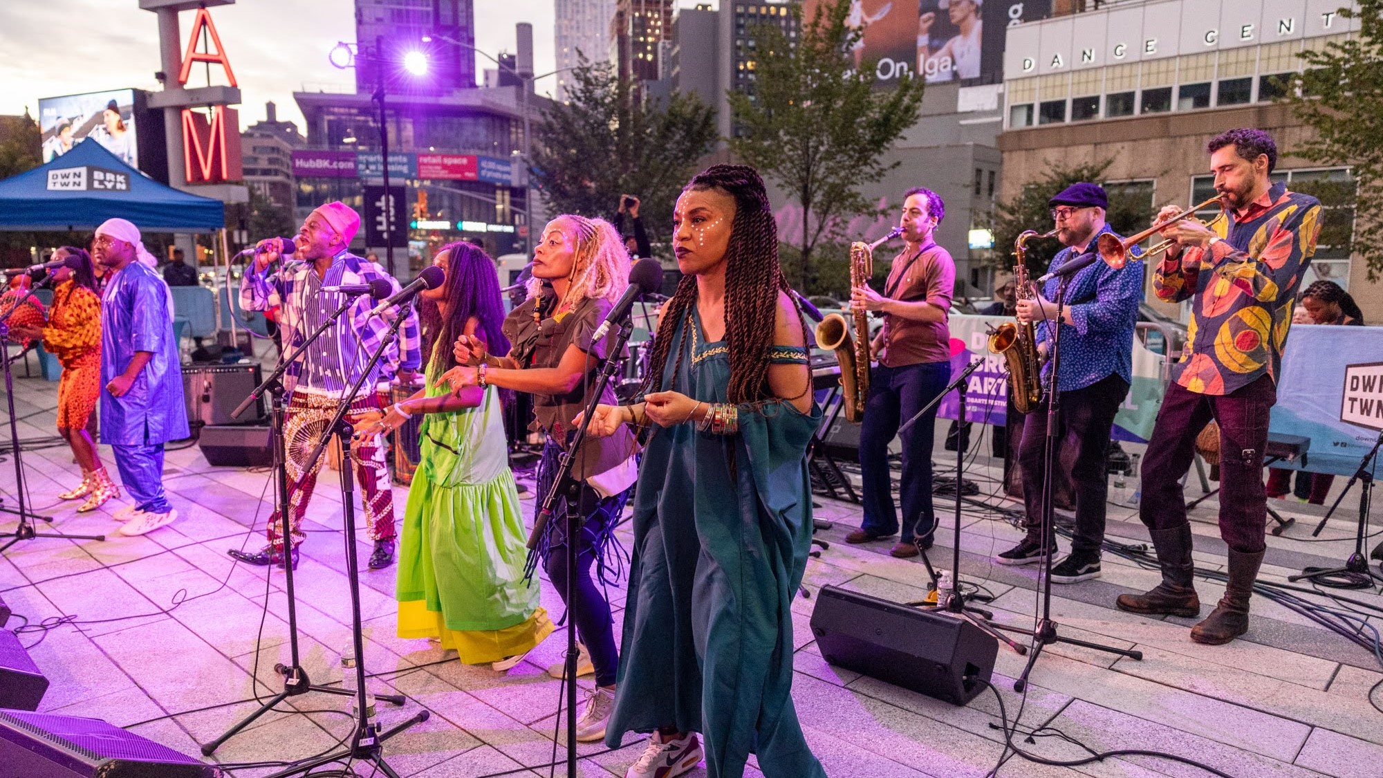 To close what turned into a gorgeous day, Chop and Quench (also known as The Fela! Band), brought their full musical heft to deliver an unforgettable performance. Bathed in the plaza’s pink and purple lights and backed by the setting sun, the ensemble drew in the crowds with two hours of music that celebrates the late Nigerian musician Fela Kuti.
