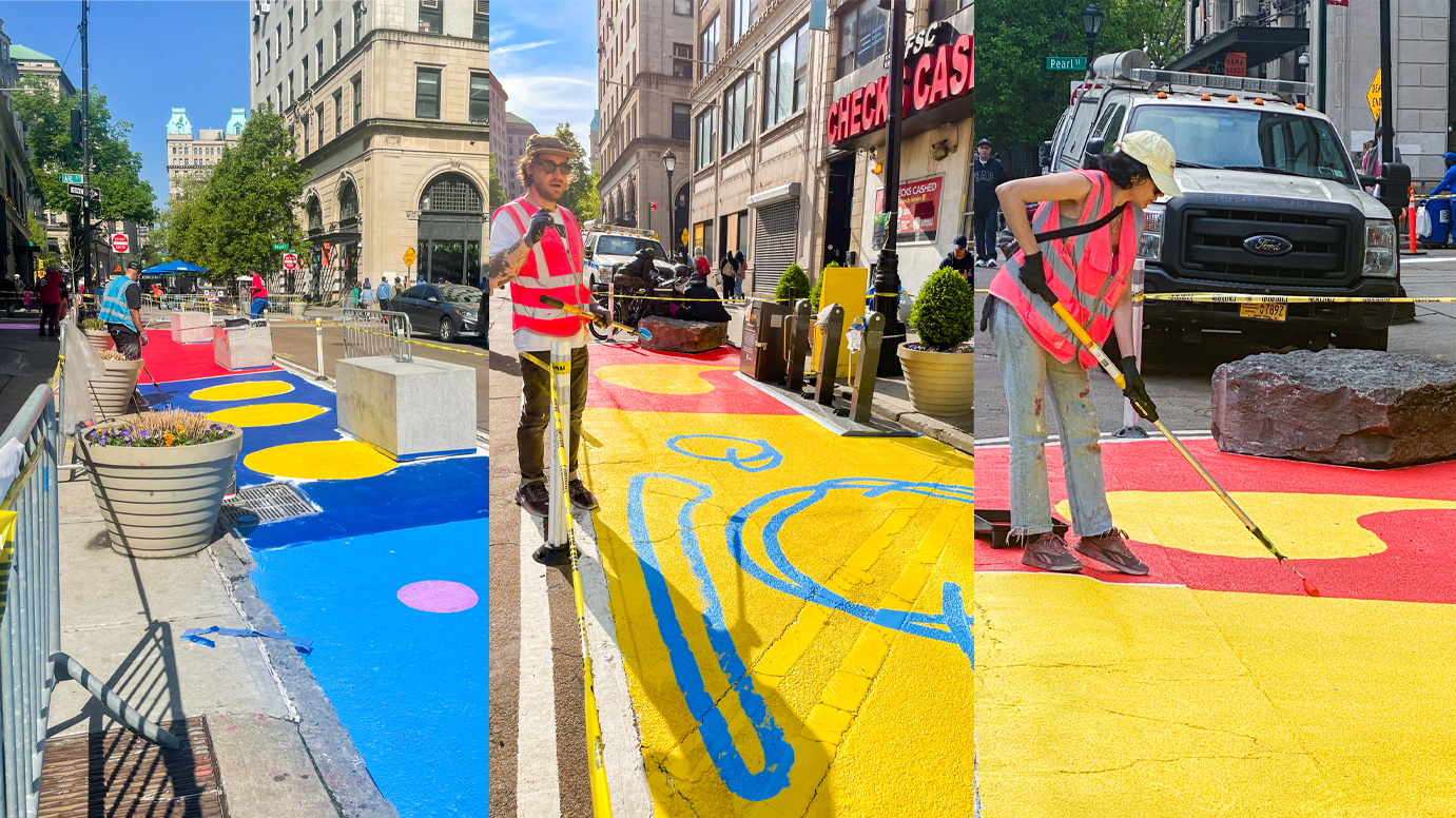 Downtown Brooklyn Partnership (DBP) in partnership with the New York City Department of Transportation (NYC DOT) today began installation of ground murals – known as “asphalt art” – within the pedestrian spaces of the neighborhood’s ever-expanding Shared Street network. In addition to Shared Street’s signature planters, granite blocks, bike corrals, and street furniture, this new public art will enhance the public realm, visually connect the area’s core streets, and increase safety by delineating pedestrian priority zones.