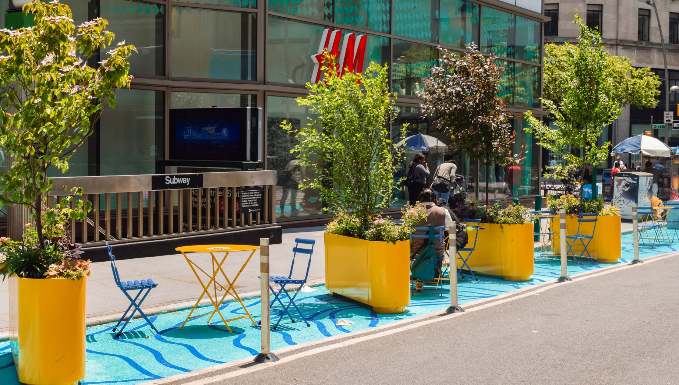 Downtown Brooklyn’s Shared Streets network got brand new colorful asphalt art. Inspired by natural landscape and topography, Terrain Park by Ann Tarantino uses vibrant hues to create a lively streetscape that complements the street furniture, bike racks, granite blocks, and signature planters of Downtown Brooklyn’s Shared Streets ped spaces.