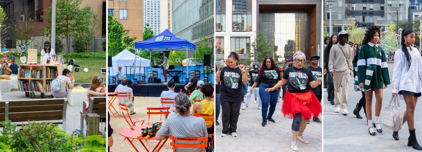 The opening of Abolitionist Place provided an additional stage for programming. The new park opened to great fanfare with a ribbon-cutting ceremony in May. In June, Street Lab came to the park weekly for a kid-friendly Reading Room; Engarde Arts produced Playdate Fest, an evening of performances by local actors and artists; and PUPS Pet Club hosted Pups in The Park, featuring a doggy runway and pup-friendly photo ops. We took to the park in July to celebrate Abolition Commemoration Day, and again in August for Albee Square Montessori School’s Welcome Day. Towards the tail end of 2024 DTBK Presents, we teamed up with Vinyl Nights to register voters at Dancing for Democracy; and the park had its first-ever runway show, BKLYN ROCKS!, with Primark in October.