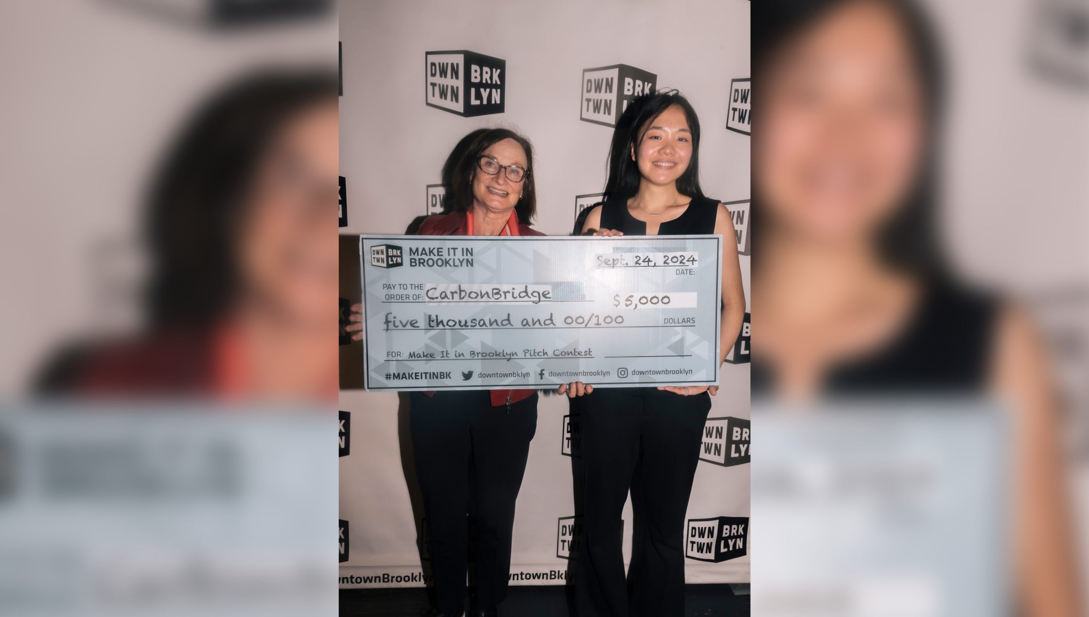 DBP President Regina Myer (left) and CarbonBridge co-founder Sophia Xu with the winning check.