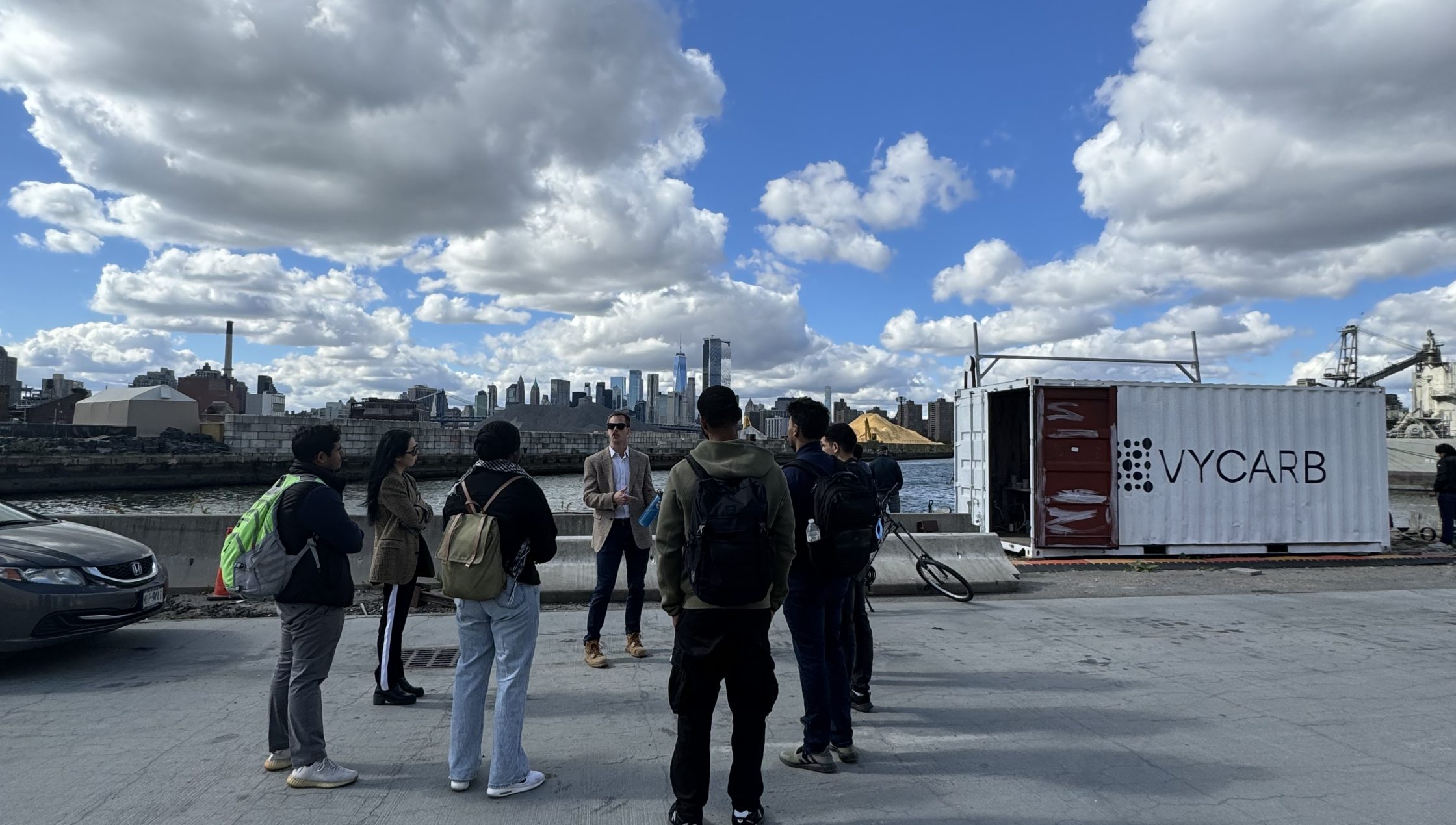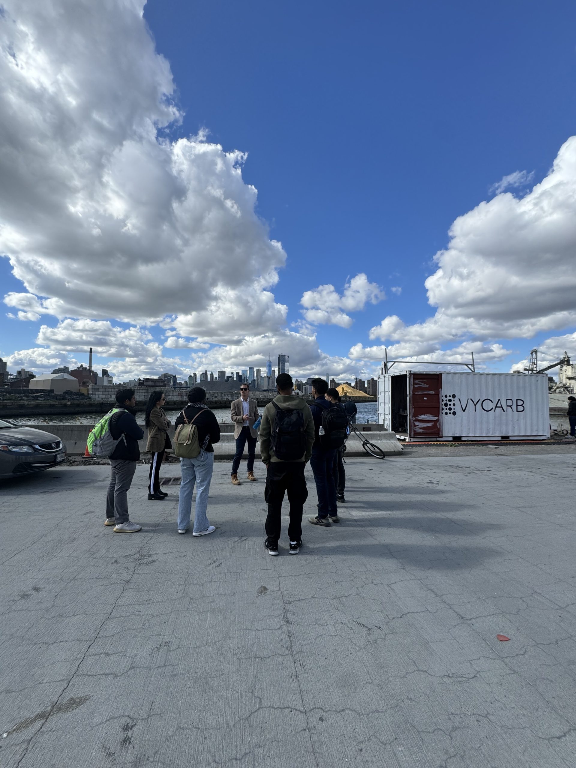 Our week began at Vycarb, a startup at the forefront of decentralized carbon removal technology. CEO Garrett Boudinot showcased their groundbreaking work in CO₂ extraction from water, demonstrating why the Brooklyn Navy Yard’s waterfront location is crucial to their operations. Students engaged with Vycarb’s interdisciplinary team of software developers, environmental engineers, and climate scientists, gaining insights into the intersection of technology and sustainability.