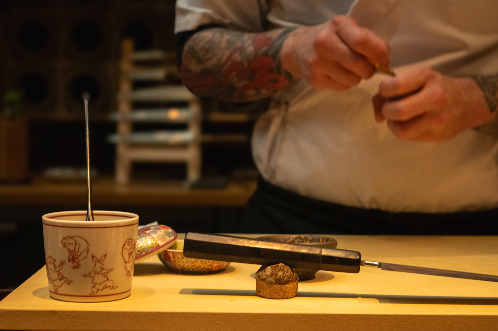 From the moment guests arrive, Sushi Koju creates an immersive atmosphere. Guests are encouraged to arrive early to enjoy Japanese-infused cocktails, sake, whiskey, or selections from an extensive wine collection, along with small bites before settling at the sushi bar. The meal follows a carefully choreographed progression:
